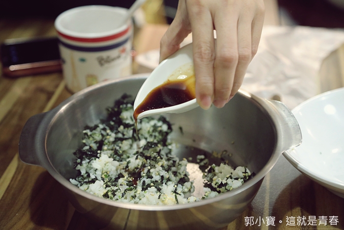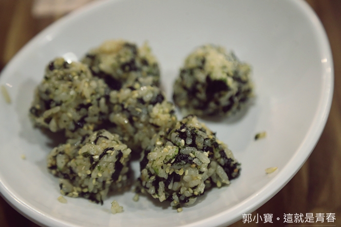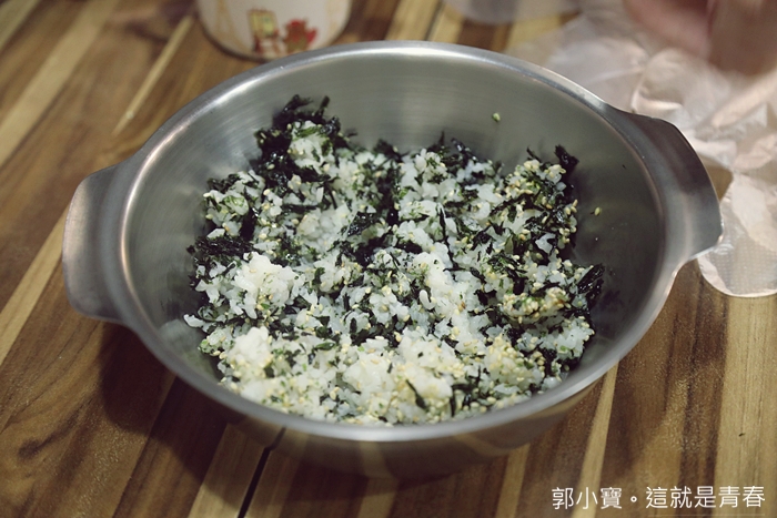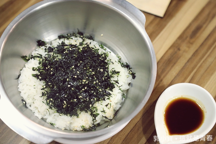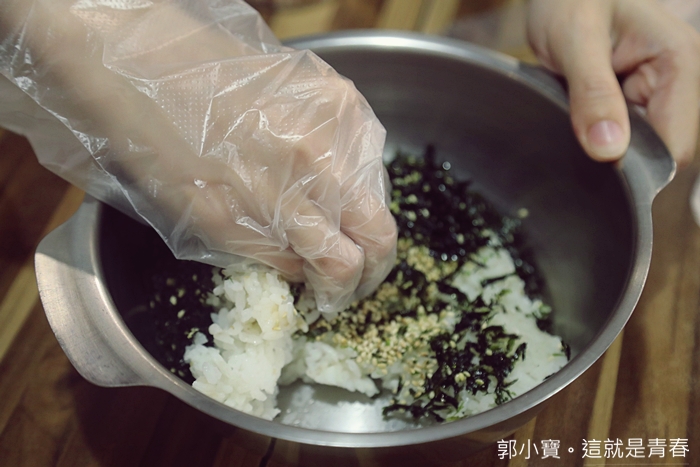 自己動手先攪拌,白飯上面有海苔跟白芝麻,稍微攪拌一下再捏成球型即可。 |