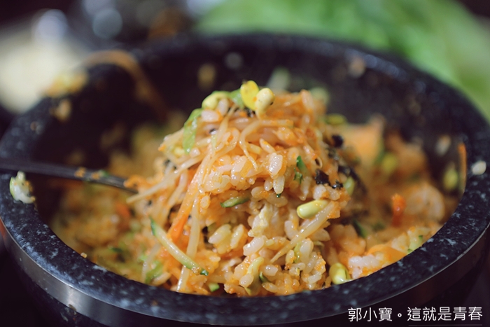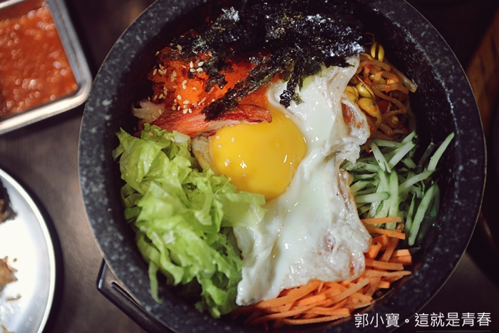 吃韓國料理就一定要有石鍋拌飯阿,特別的是這邊的石鍋拌飯都可以依照客人的口味辣度調整,我們點了一個比較特別的明太子蟹肉,可以看到上桌時候石鍋裡面還有滿滿的明太子。 |