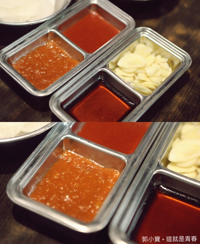 調味料的部分也都在自助吧台區,除了很經典的辣醬要多裝一點以外,還有烤肉醬也是他們家特調的味道,我個人覺得豬五花包生菜再加上蒜片很無敵,所以我一開始就瞄準了蒜片XD |