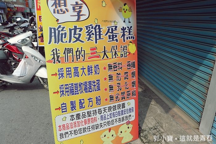 在地的朋友就推薦我這一家想享雞蛋糕,因為她說老闆娘也是做給自己的孩子吃,所以食材跟原物料都有特別挑過,加上她在楠梓的名氣頗高,所以我們當天到達楠梓後就先找尋這一家店,就在常德路上,在一間鐵皮屋裡面就發現這一家想享雞蛋糕。 |