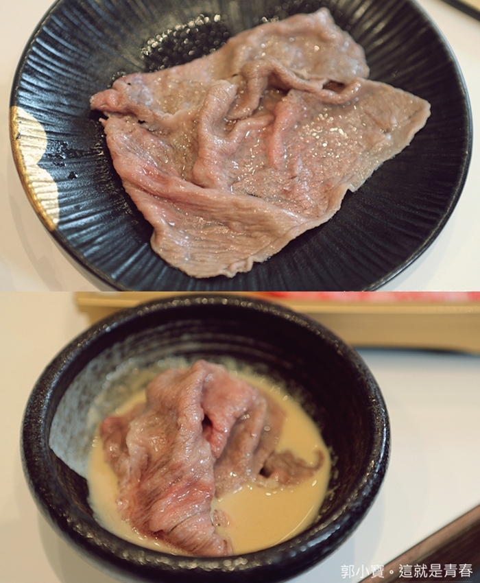 我們夾的太慢了有點過熟,壽喜燒醬的味道基本上會逮點偏甜鹹的滋味,單吃的話味道還滿重的,搭配豐沛油脂的肋眼部位,放在嘴裡彷彿都像是會融化一般的軟嫩。 |