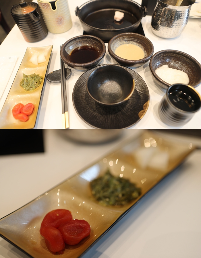 餐具的選擇上也都非常貼合日式風格,有點像缽的醬料碗也很道地,是標準涮涮鍋會用的規格,搭配三款開胃小菜,一開始就讓人非常滿意,開胃菜是吃完可以無限續點的。 |
