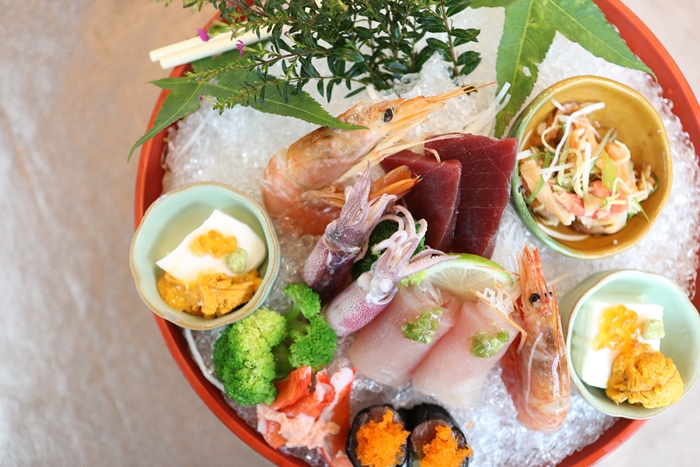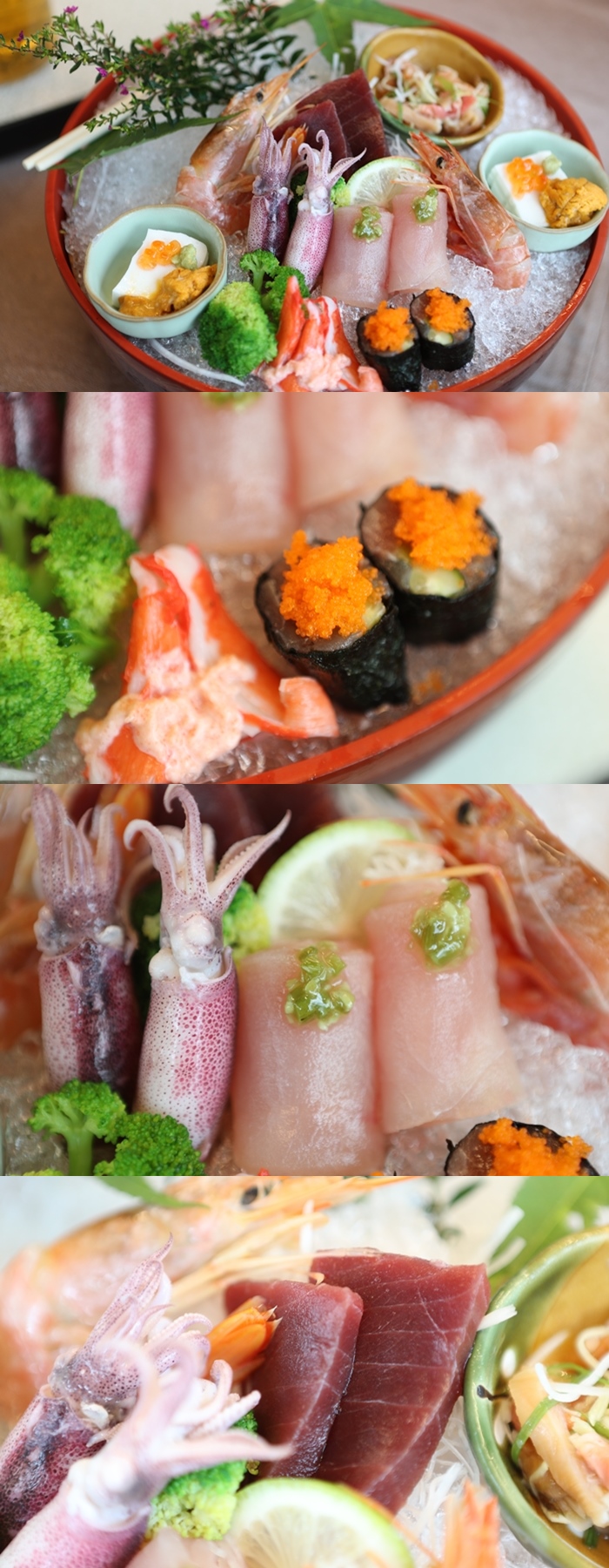 裡面有海膽豆腐、黑鮪魚、旗魚生魚片、小卷、蟹肉、甜蝦等 |