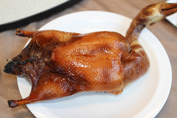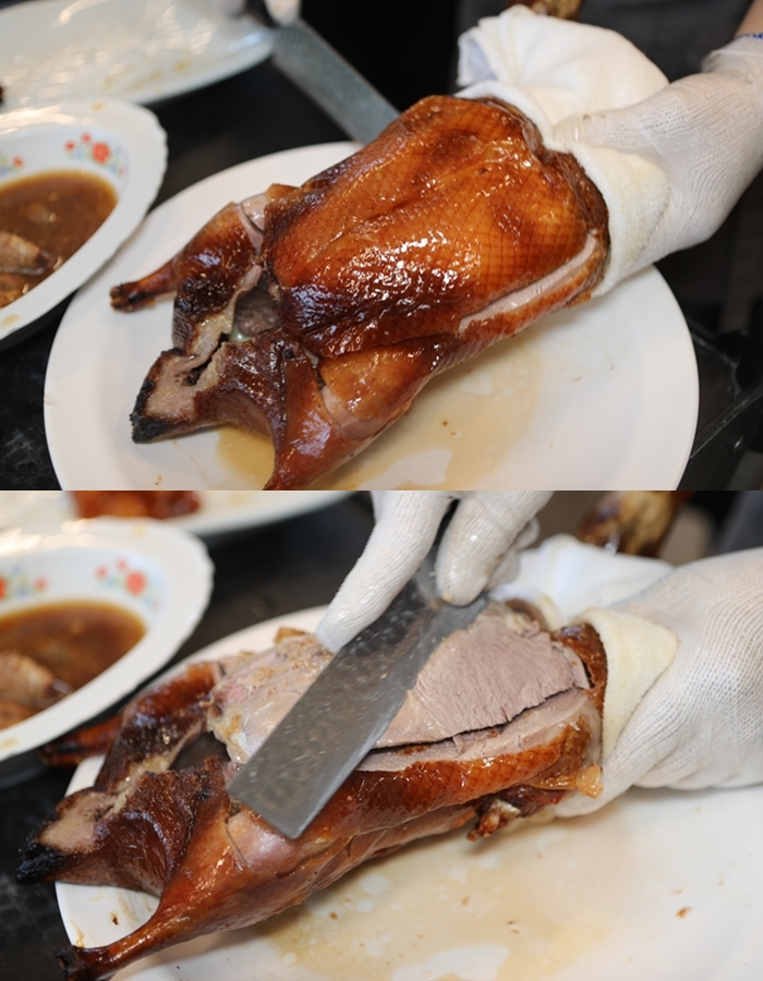 師傅俐落的片鴨動作很熟練,櫻桃烤鴨二吃必須在預約的時候就要預訂,而且一天只有兩隻,這道根本就是賠錢賣的,看看這櫻桃鴨的肉還帶點粉紅色真的非常誘人。 |