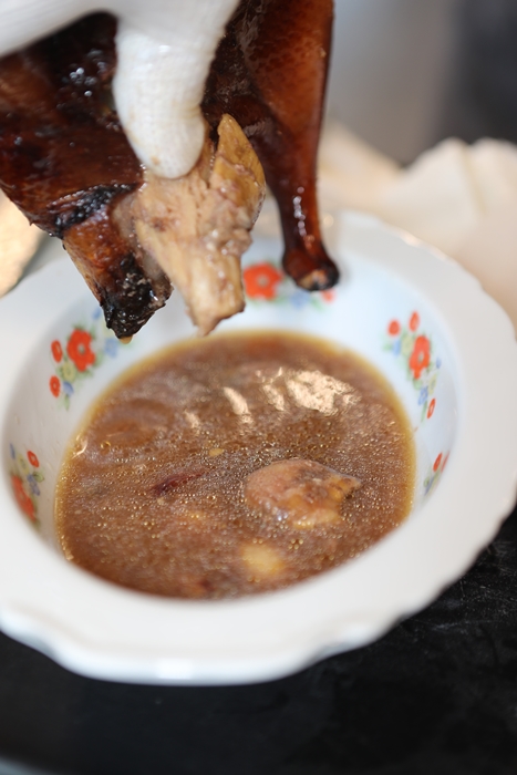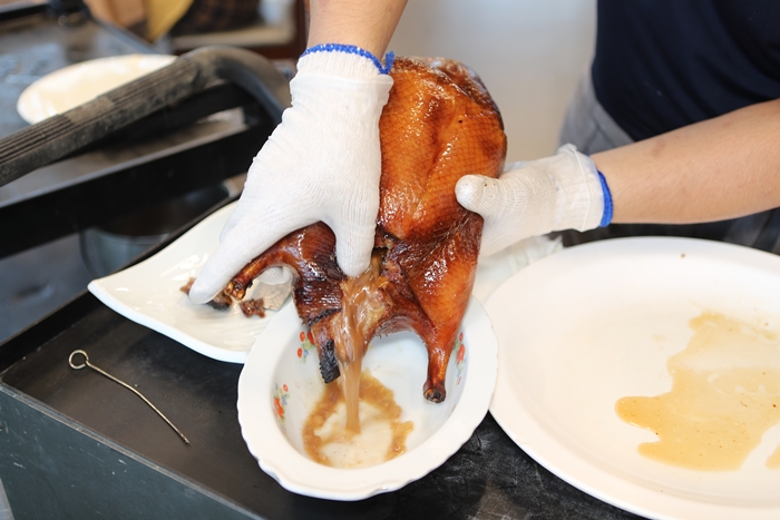 師傅先把鴨屁股剪開,把裡面的湯汁都先倒出來,等等會再一起入鍋炒鴨架,倒出來的那一剎那一整個香氣四溢,看得我口水直流XDDD |