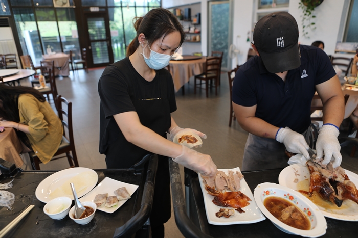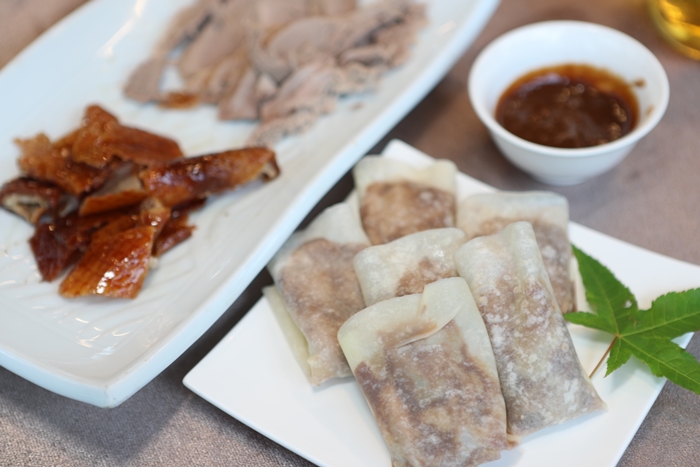 另一個工作人員還幫忙把甜麵醬跟鴨肉還有三星蔥段包裹起來放好,完全不用自己手動,坐在位子上等待美食就好了,這真的也太貼心了。 |