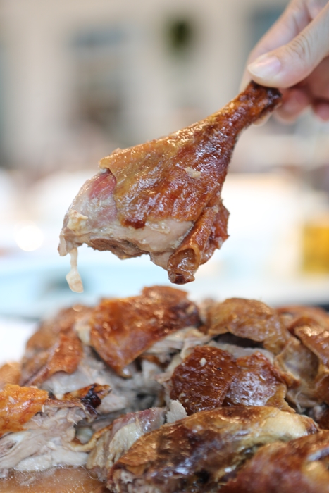 過了一會鴨架登場也是氣勢十足,鴨架處理的方式好像也跟一般的不太一樣,似乎是做脆皮的感覺,有點像是脆皮雞的做法,不過我很愛這樣的台菜系,瞬間想轉頭跟工作人員要瓶啤酒。 |