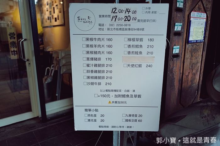 電話: 02 2250 0818 地址: 220新北市板橋區銘傳街94巷8號 營業時間:12:00–14:00, 17:00–20:30 星期一休息