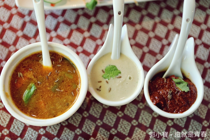 印度料理就是會搭配很多特製的香料醬汁,所以到最後我們也真得眼花撩亂,到底哪個醬汁搭配哪道菜都有點混亂了。