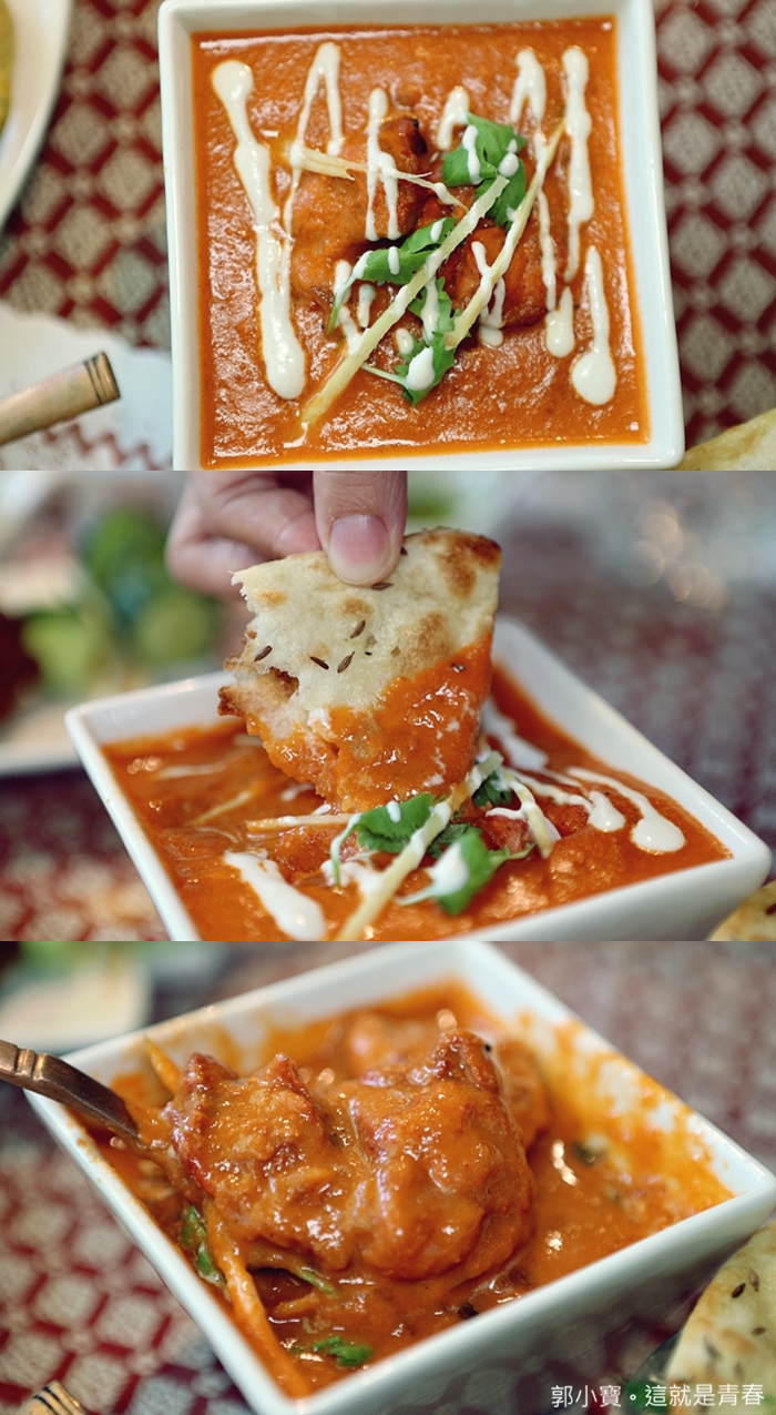 沾著紅醬奶油雞肉咖哩非常搭,紅醬咖哩的香料味道非常豐富,根本一開始後就無法停止下來的美味,但是如果可以更辣一點會更完美,裡面還有超大塊的雞肉,店內也有很多咖哩可以搭配烤餅,光是烤餅的種類口味也非常豐富。