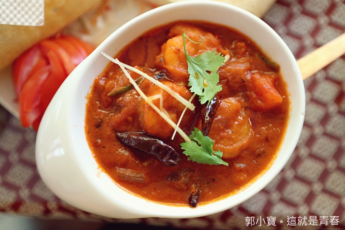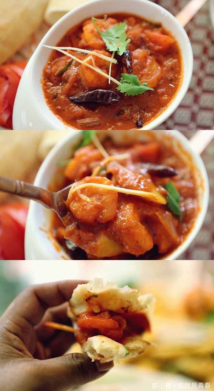 因為老婆跟嬰皇前面幾樣菜就夠它們吃了,Sree India Palace斯里印度餐廳大部分的菜都不是狠辣或者是無辣,對我來說真的不夠過癮,所以最後幾樣我點了幾款辣味的咖哩要好好的享受一下,蝦仁都非常大隻,尤其辣味咖哩真的太好吃,搭配烤餅真的讓我無法自拔,我超級愛的阿,一整張餅皮跟咖哩都被我吃光。