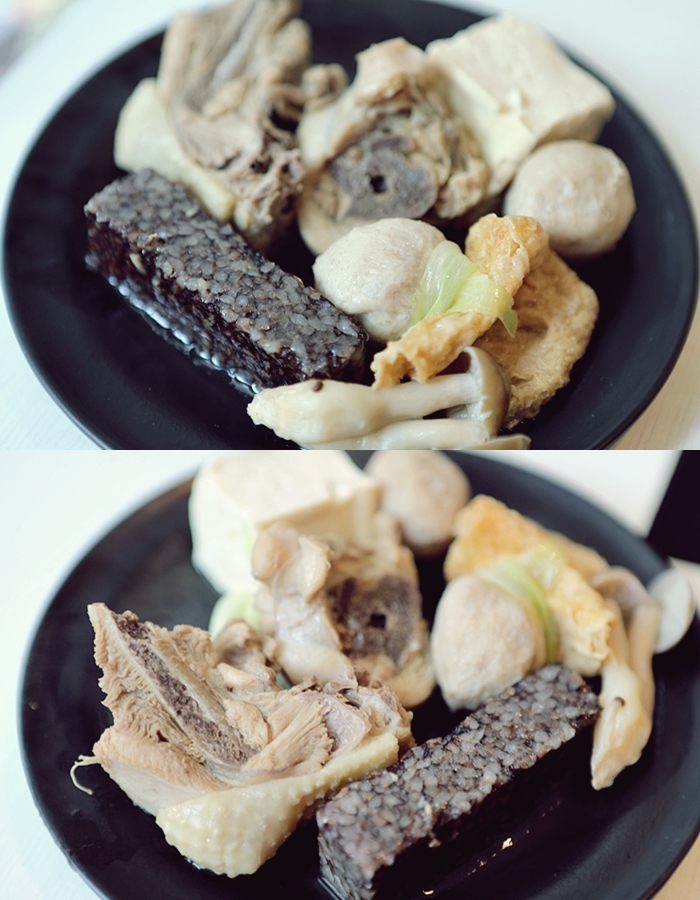 麻油酒糟土雞鍋的菜盤沒有什麼火鍋料,用大量的食蔬取代,米血軟黏的口感我很喜歡,丸子也很優,吸飽湯汁的豆腐更是大推,整體上來說是很不賴的鍋物。 |
