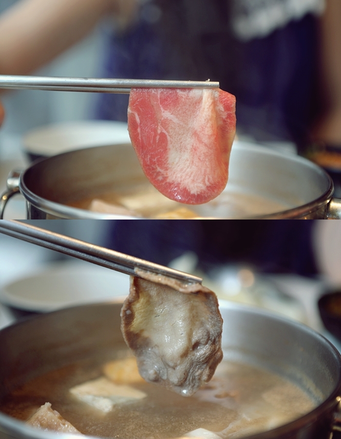 牛舌的品項看起來相當不錯,不管是色澤還是新鮮度感覺都在水準之下,下鍋涮一下後就可以起鍋,看得我一整個就是口水直流。 |