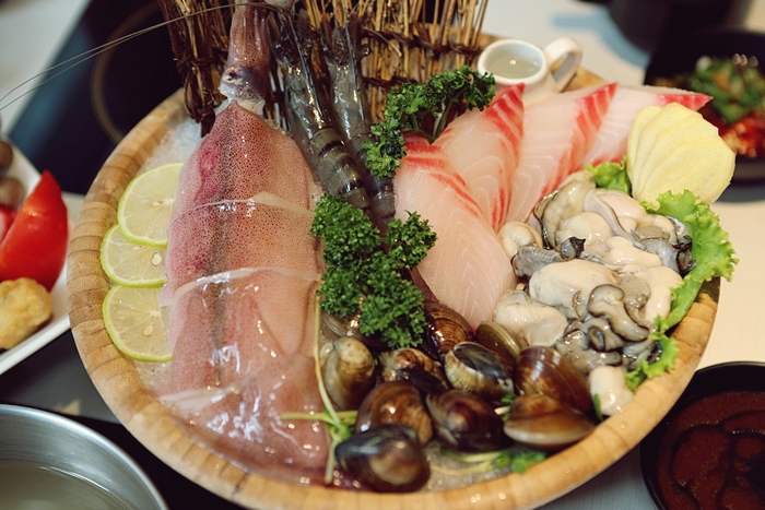 海鮮拼盤用木桶裝了一大桶,還附上一小壺的米酒去腥還滿貼心的。 |
