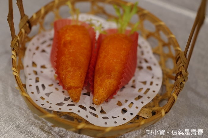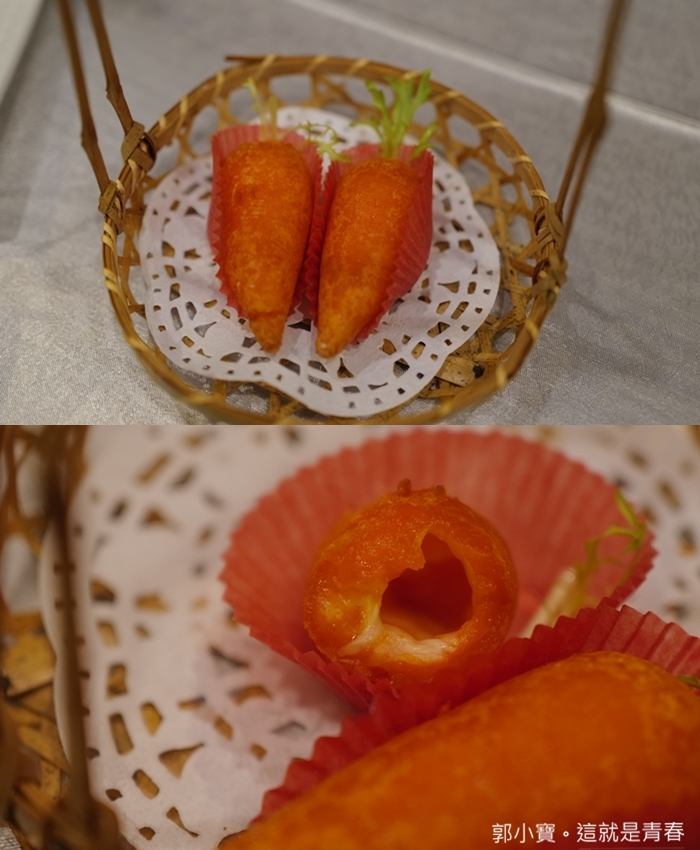 造型非常可愛,上桌的時候真的會以為是兩跟胡蘿蔔,cola一直很抗拒說不要吃紅蘿蔔,後來咬了一口才知道裡面是起司,些許的起司搭配外酥內軟蘿蔔造型炸物,一整個非常討喜。 |