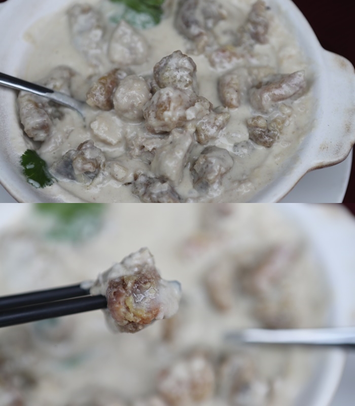 像拳頭一樣的蝦球也是大宅門乾鍋鴨頭的特色,也是很多大人小孩都喜歡的一道,果律蝦球是單顆計價,雖然像拳頭一樣大,但是單顆100元的價位我個人覺得爽度還滿高的,一口咬下那酥脆的粉皮跟彈牙的蝦肉,真的滿足到不行。 |