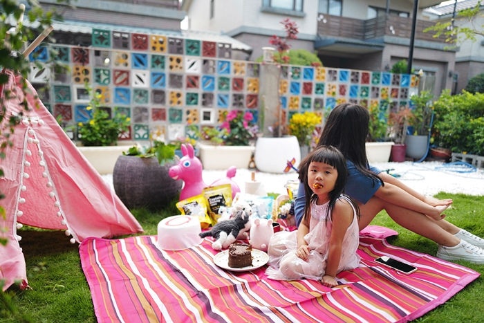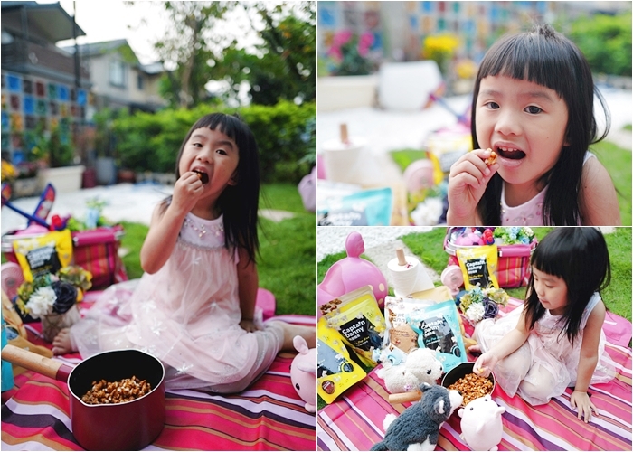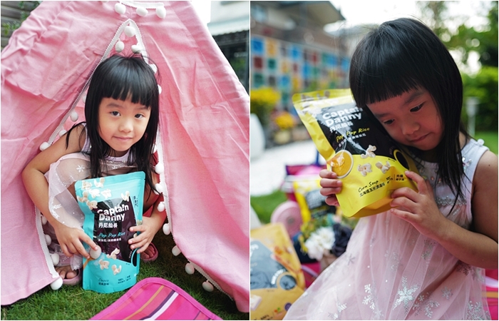 出門野餐或是露營的時候,到達目的地我們通常都會先拆一包 米米花解一下小朋友的嘴饞,有零食可以吃她們就會安靜許多,Cola也會約她的寵物娃娃們一起辦家家酒吃飯。 |