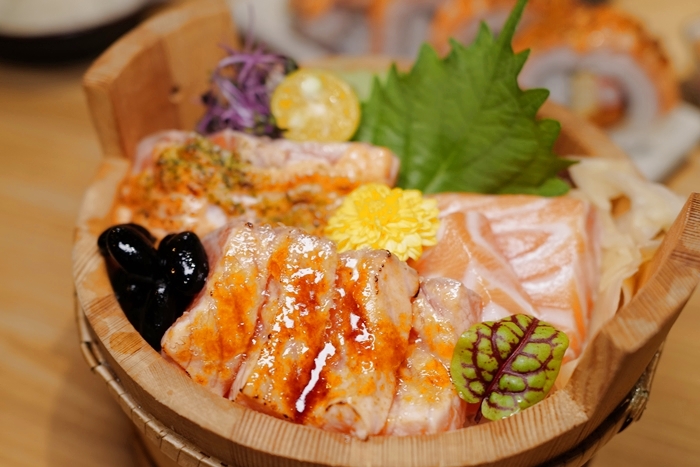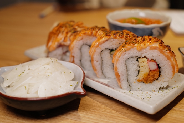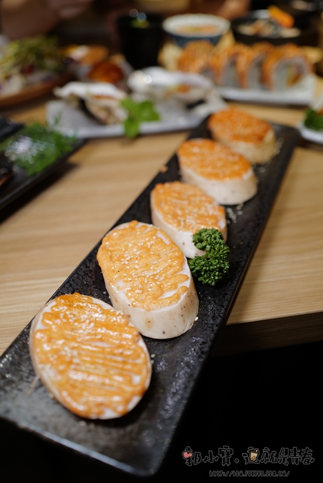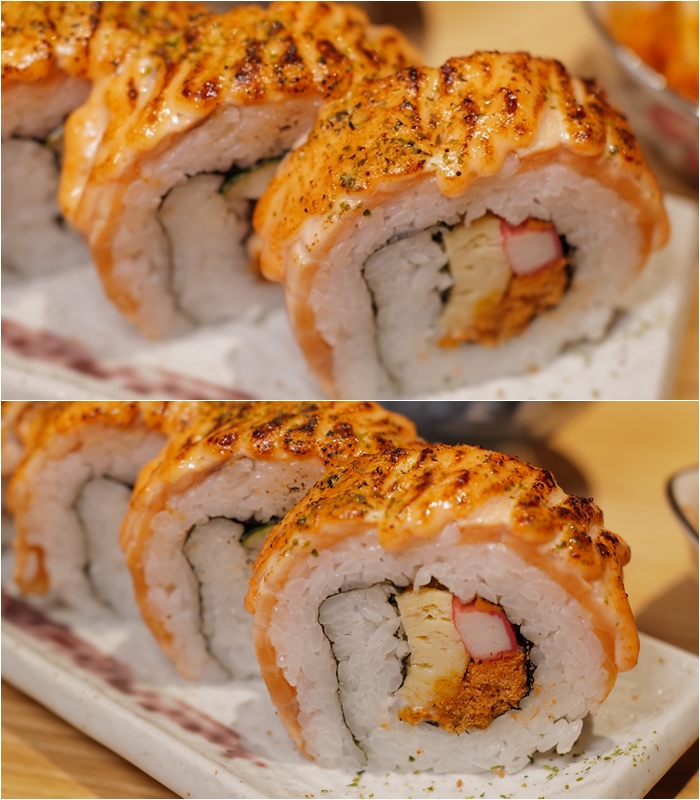 卷壽司的個頭非常大,比起一般的卷壽司大上許多,整整五顆誠意滿滿,上面是美乃滋稍微炙燒過,酸酸甜甜的很對味,吃起來的滋味很不錯,飽足感也很足。 |