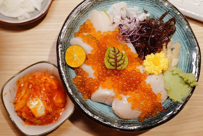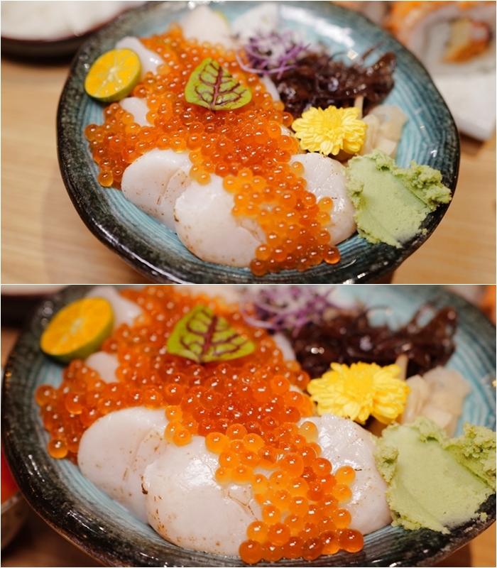 滿滿的生食級大干貝真的太過癮,裡面整整快8.9顆大干貝真的很豪氣,加上滿滿的鮭魚卵,視覺感就滿分了,醋飯的比較我很喜歡,比起一般日本料理的醋飯味道在更淡一點,帶點甜味連女兒都很喜歡它們家的醋飯比例。 |