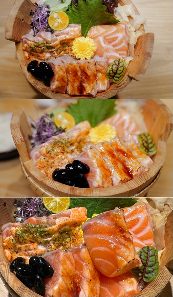 這一盆是太妃的,太妃對於鮭魚有莫名的喜愛感,對於鮭魚的要求是很高的,取自鮭魚的三個部位來做的鮭魚三重奏,讓你一次吃到三種鮭魚部分的美味,生食、焦糖醬跟炙燒,鮭魚的品質非常好,油脂超多又甜,廚師特別切的較厚,入口的口感軟嫩多汁,很少吃到鮭魚丼的鮭魚品質那麼好,尤其它們的鮭魚肚一直讓太妃讚不絕口。 |