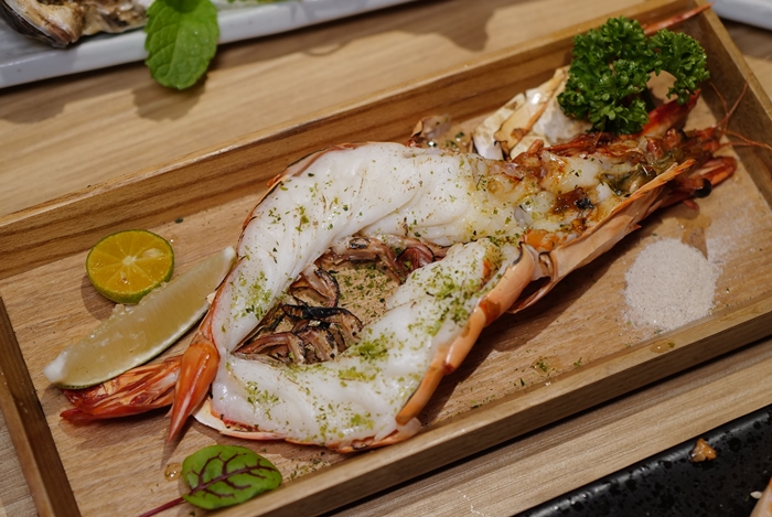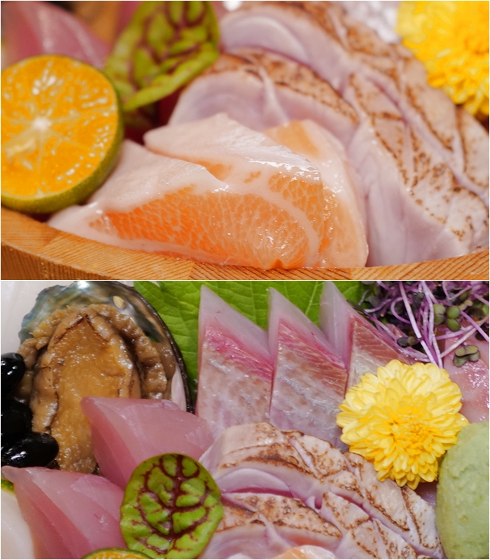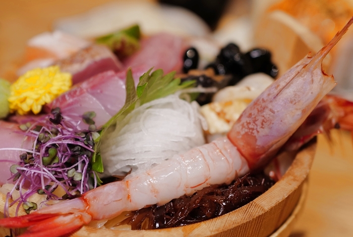 生魚片的部份都是屬於厚切,數一數這一盆裡面至少超過十種食材,且生魚片咬下的汁非常多且鮮甜,干貝夾著萊姆吃起來非常爽口,還有鮑魚的口感也超好,光是上面這一堆生食海鮮不論在日本料理還是海產店至少都要500起,更何況還有一尾超大甜蝦。 |