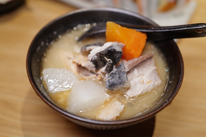 味噌湯讓太妃跟女兒都說讚,偏台式口味的味噌湯因為用量大量的蔬果加上味噌醬熬煮,口味湯頭味道喝起來偏甜,而且還有魚肉邊角料,真的很超值!! |