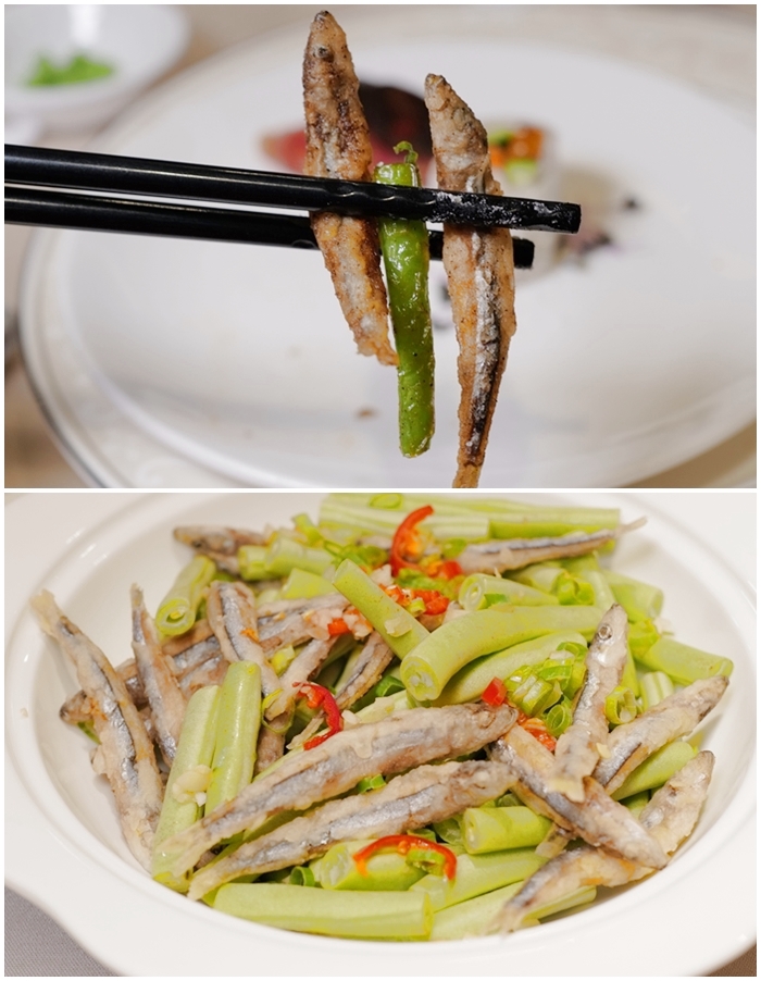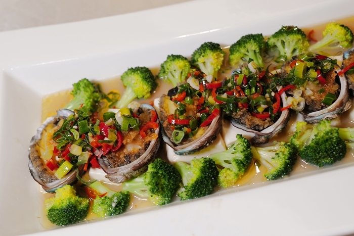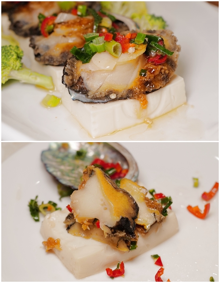 鮑魚的尺寸頗為大。同樣是清蒸後再分切搭配底下的棉豆腐,方便客人食用,鮑魚的口感確實彈脆,這樣的口感確實是活鮑魚的最好證明,淋上廚師特調的醬汁頗為提味。 |