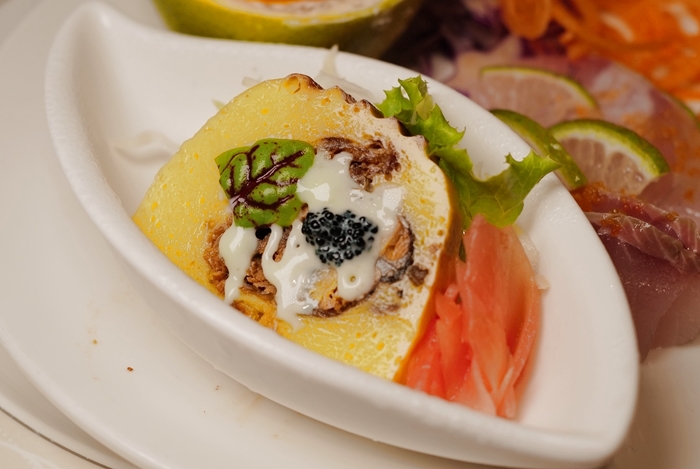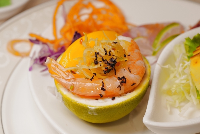 挖空的柳橙放入奶酪搭配蝦子,蝦子也非常彈牙,我覺得海鮮的部分非常有水準,果然是專門做台菜的餐廳,對於海鮮的用心程度都很高。 |