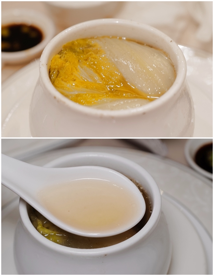 燉煮到軟爛的娃娃菜我超愛,湯頭非常清,應該有再濾過不會喝到渣渣的口感,濾的飛長清,很有水準,湯頭喝起來非常溫潤,那甘口的滋味很討喜,不會過度調味的感覺,很愛! |
