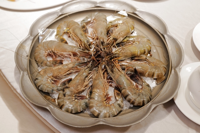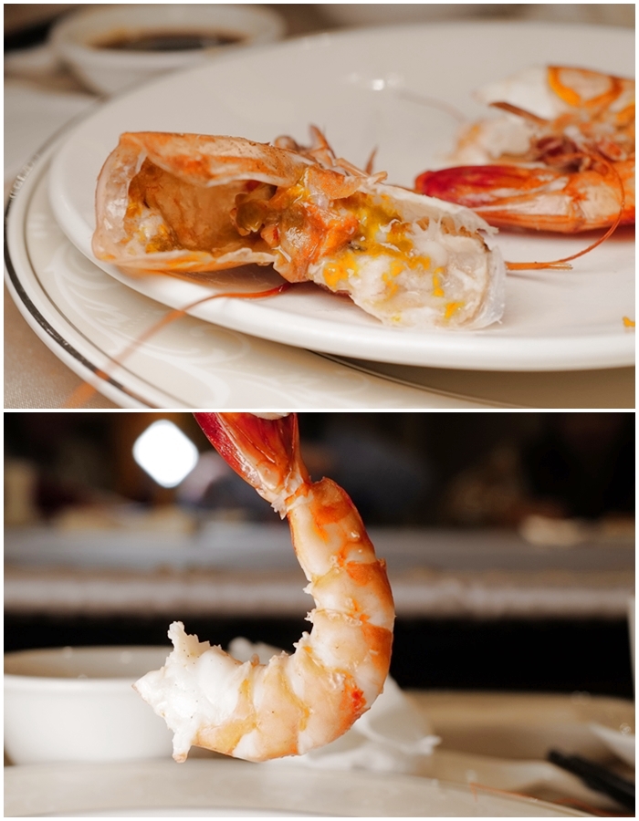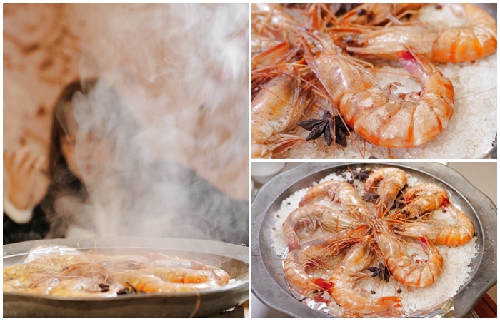 選用宴會餐廳最常見的鹽烤海大蝦,這樣最能體現出海大蝦自然的鮮甜。 |