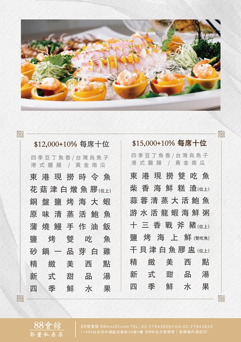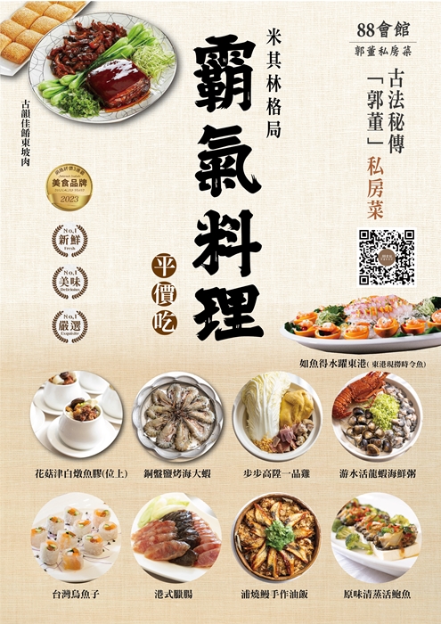 古早味經典台菜料理著稱的「88號會館-郭董私房菜」是由排隊才吃得到的「台南海鮮會館」老闆「郭董」依據傳承自家族的60年古董菜單為藍本,親自設計、創作並指導的澎湃菜色,精選產地直送的活海鮮食材,遵循細緻繁複的古法工序,呈現道道珍饈美饌,被忠誠消費者譽為「米其林格局」的霸氣料理。