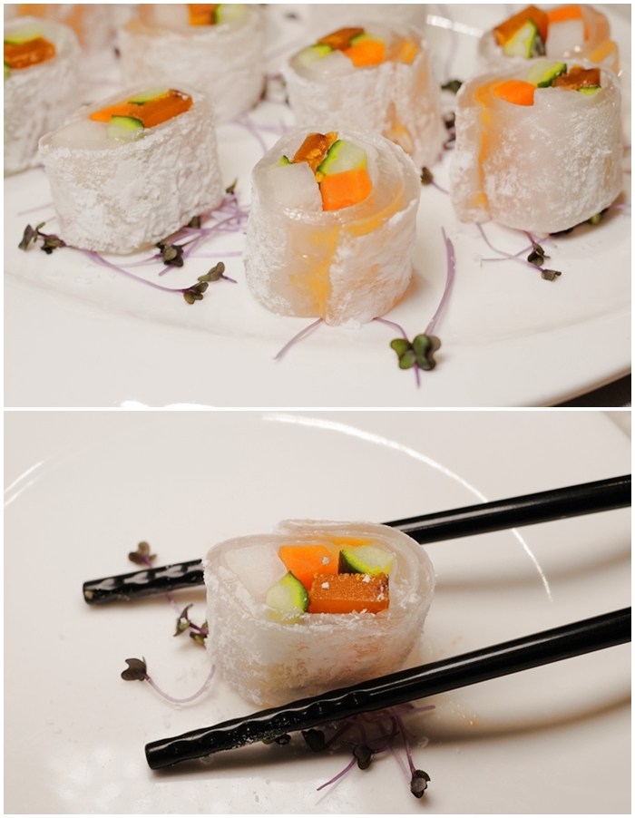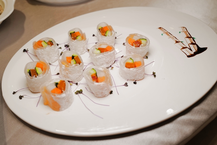 一上場的是四小菜,四前菜搞的就很霸氣,外層軟糯像涼糕的粉皮包裹著烏魚子還有小黃瓜、蘿蔔等配料,入口的口感層次豐富,鹹點帶點油香的烏魚子讓人頗為滿意,這樣的口感滋味頗為新穎,讓烏魚子吃起來不會那麼的乾口。 |