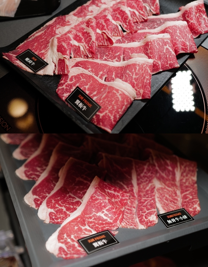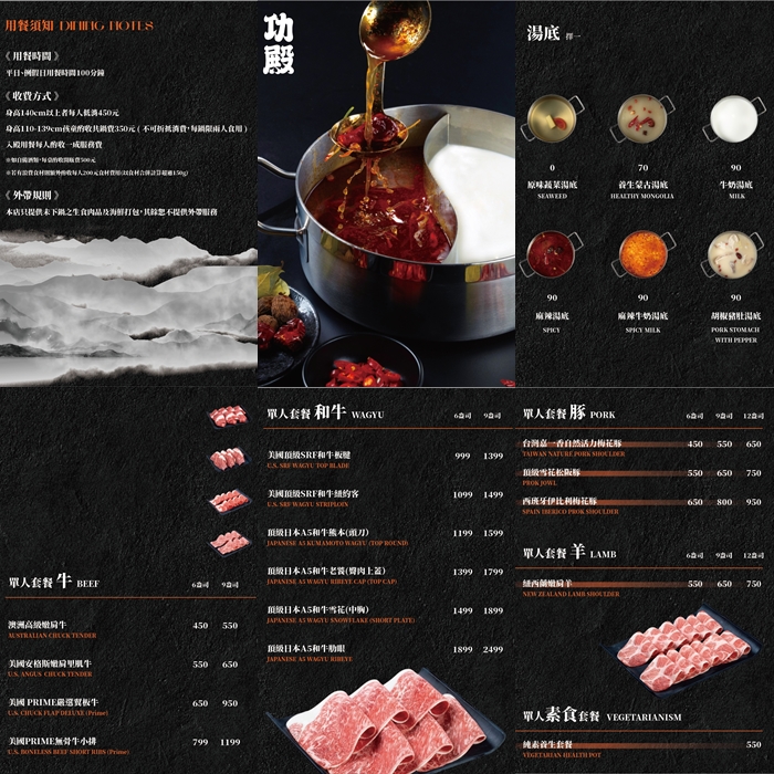 功殿特級火鍋最主要的商品除了六款自製研發的湯頭以外,主要的肉品還是以和牛、美牛、澳牛、豬肉等為主! |