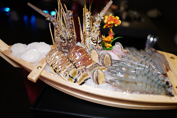 隔壁桌的海鮮船太霸氣,尤其那澳洲小青龍讓我口水直流,海鮮船上除了澳洲小青龍以外還有日本生食干貝,白蝦、鯛魚、小鮑魚超豐富。 |