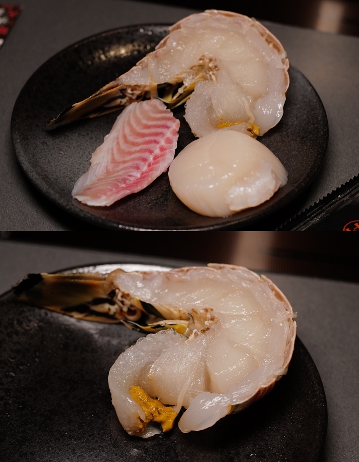 偷偷ㄎ一ㄤ了隔桌友人海鮮小套餐,生食級干貝看起來好新鮮,而且澳洲小青龍還有抱蛋!!! |