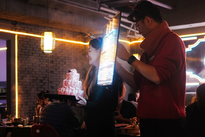 當天我們一群人一起用餐過聖誕,我們當中有人點六人套餐、我們一家則是單點單人套餐,店內的工作人員滿多的,且服務非常親切也很快速,加上爐具是IH爐所以加熱非常快,也不用特別會被IH爐玻璃板燙到。 |