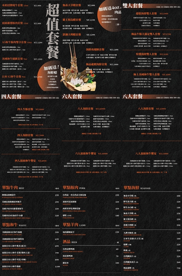 隔壁桌的六人海陸套餐 $10999 ,看起來相當豪華,等於一個人平均1800元左右,這套餐上桌就相當的霸氣,提供三款牛肉三款豬肉跟超大海鮮船! |