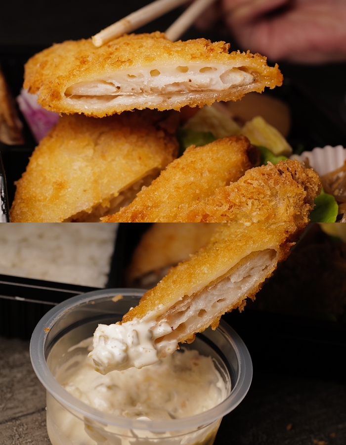 炸鱈魚便當就危險一點,鱈魚肉較少一點,中間似乎有起司,一口咬下好像只有咬到麵衣的感覺,不過凱薩醬調的很好吃,且炸鱈魚吃起來也不會滿嘴油,這一點滿厲害的。 |