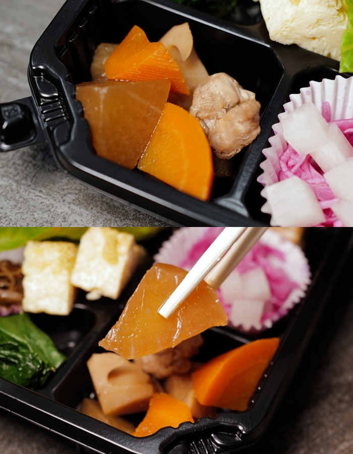 日式燉菜的部分也燉紅白蘿蔔、雞肉、蓮藕、雞腿肉、香菇等菜色,口味是偏甜的甘露主醬油味,很適合女生的胃口。