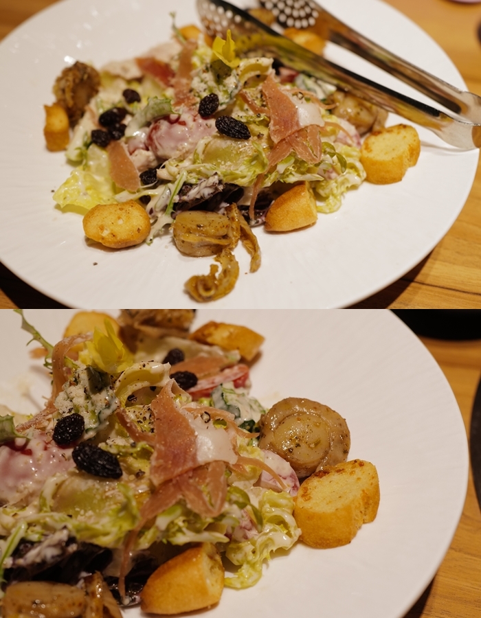 凱薩沙拉我們都覺得不錯,吐司塊比一般的更硬一些,可能是因為這樣才叫嘎崩脆,凱薩醬調的也很討喜,味道恰到好處,份量也剛好。 |