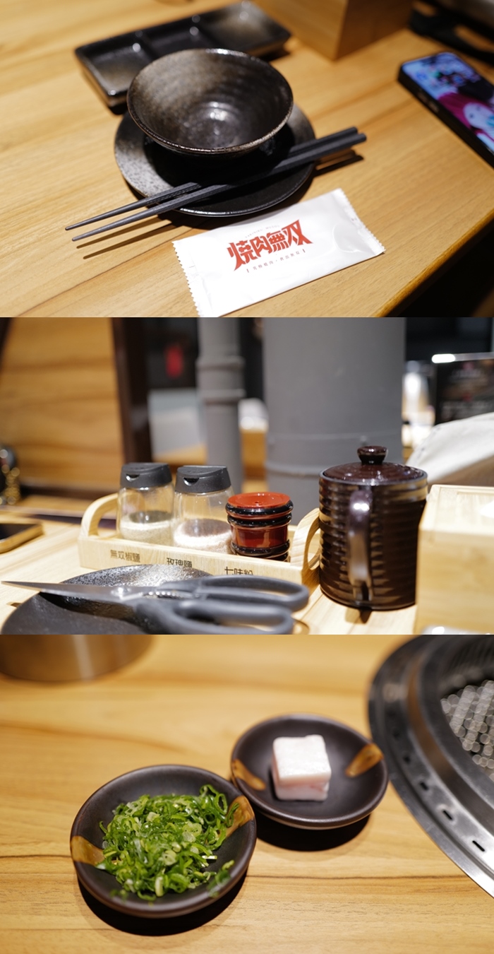 燒肉無雙的器具用的都還不錯,幾乎都是瓷器餐具,無美耐皿餐具,調味料跟油壺都擦拭的滿乾淨的,蔥花切的也很漂亮,豬油也給的很肥。 |