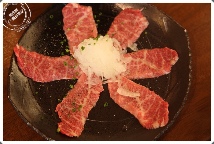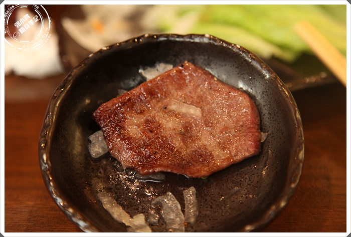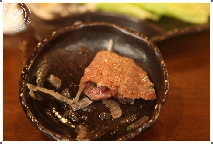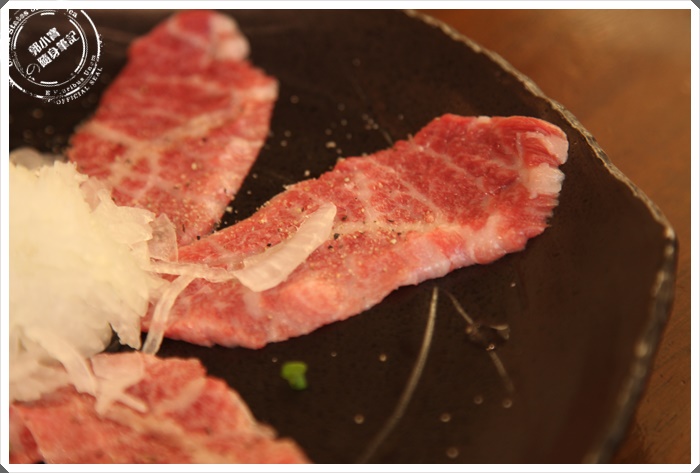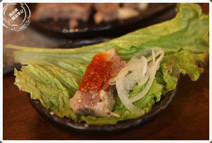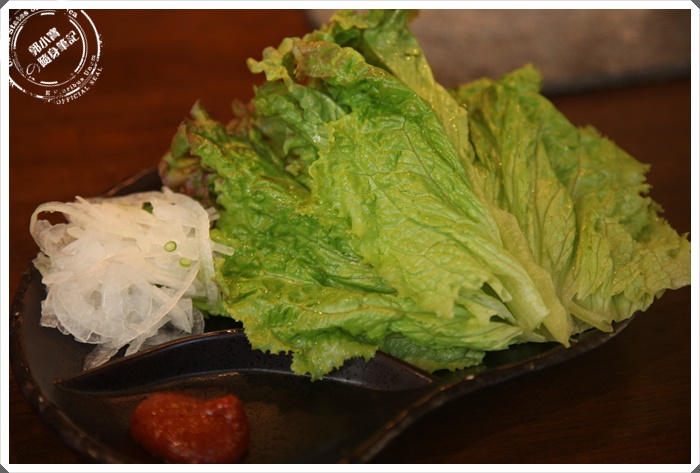 | 超特別的就是石垣牛五花肉上來的時候是已經煮熟的牛肉,讓我們三個人驚呼了一聲懷疑是不是送錯餐,不過他們的五花肉確實是這樣處理的,上來的時候還會送一盤生菜跟聲洋蔥絲上來,一旁的醬料是辣味噌醬。 |